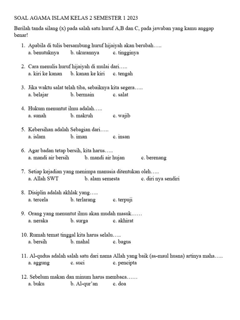 Memasuki semester 1 kelas 2 Sekolah Dasar (SD), mata pelajaran Agama Islam menjadi fondasi penting dalam menanamkan nilai-nilai luhur dan pemahaman dasar tentang ajaran Islam. Pembelajaran di kelas 2 ini berfokus pada pengenalan rukun Islam, rukun Iman, akhlak terpuji, serta kisah-kisah teladan para Nabi dan Rasul. Untuk membantu siswa kelas 2 memahami dan menguasai materi pelajaran Agama Islam dengan lebih baik, artikel ini akan menyajikan kumpulan soal latihan semester 1 yang disusun secara komprehensif.