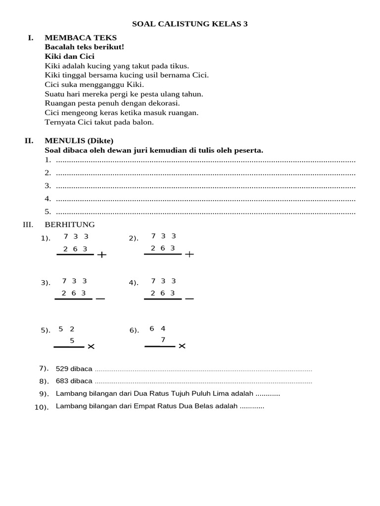 Tingkat kelas 3 Sekolah Dasar (SD) merupakan fase krusial dalam perjalanan pendidikan seorang anak. Di jenjang ini, dasar-dasar membaca, menulis, dan berhitung (calistung) yang telah mulai ditanamkan di kelas sebelumnya akan semakin diperdalam dan diperluas. Kemampuan calistung yang kokoh di kelas 3 bukan hanya sekadar pencapaian akademis, tetapi juga menjadi fondasi yang kuat untuk penguasaan materi pelajaran di jenjang selanjutnya, bahkan hingga pendidikan tinggi. Artikel ini akan mengupas tuntas mengenai soal-soal calistung yang umum dihadapi siswa kelas 3, strategi pembelajaran yang efektif, serta pentingnya peran orang tua dan guru dalam mendukung perkembangan kemampuan ini.